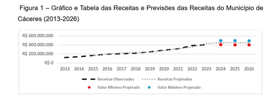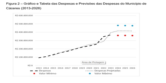 A análise das receitas e despesas do município de Cáceres entre 2013 e 2023 revela uma trajetória de sustentabilidade fiscal, com receitas superando as despesas ao longo do período. As projeções para os anos de 2024 a 2026, embora indiquem uma leve tendência de queda tanto nas receitas quanto nas despesas, mantêm o cenário de equilíbrio orçamentário.
