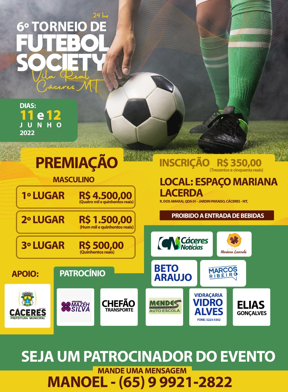 Nos dias 11 e 12 deste mês (junho), acontece o 6º Torneio de Futebol Society no Espaço Mariana Lacerda a partir das 17h em Cáceres. A inscrição para participar da competição custa R$ 350,00 (trezentos e cinquenta reais).