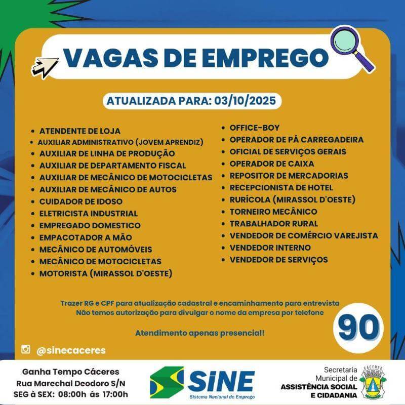 O Sistema Nacional de Emprego (Sine) de Cáceres divulgou nesta sexta-feira (3) a atualização da lista de oportunidades de trabalho disponíveis no município e região. Ao todo, são 90 vagas distribuídas em diferentes áreas, contemplando desde funções administrativas e de atendimento até serviços gerais, indústria e comércio.