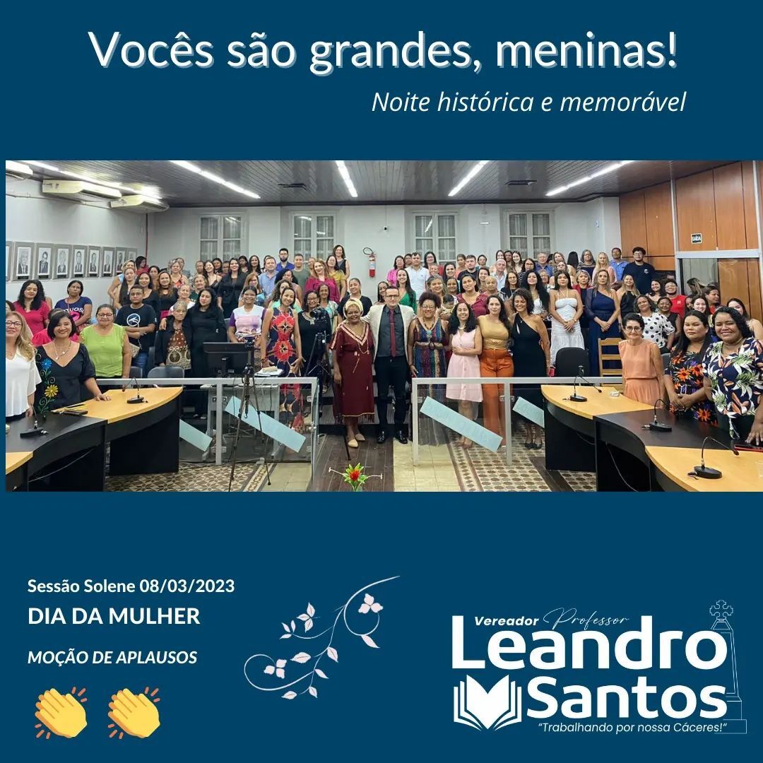 Em alusão ao Dia Internacional da Mulher (8 de Março), o Vereador Prof. Leandro (União Brasil) entregou, nesta quarta-feira (08), 150 moções de aplausos a lideranças femininas, em reconhecimento à sua importância na sociedade cacerense. A sessão solene aconteceu na noite de ontem às 19h na Câmara Municipal.