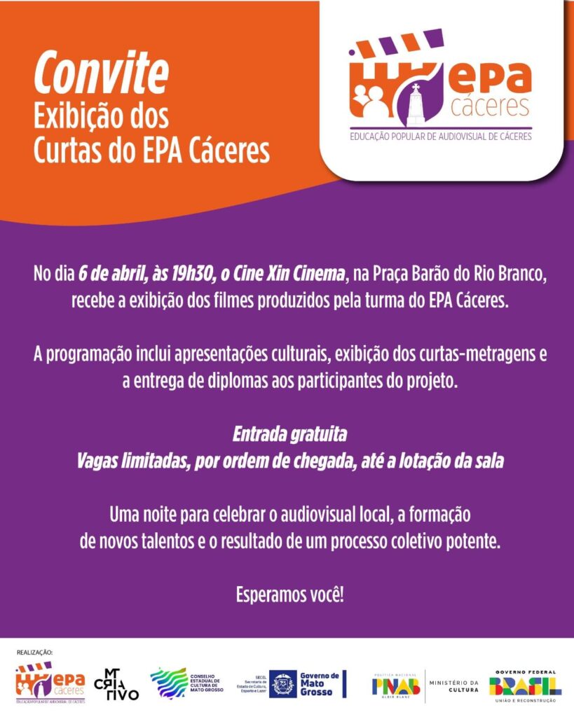 Além das apresentações culturais e exibição dos curtas-metragens também haverá entrega de certificado para os(as) participantes do projeto e apresentação sobre as atividades realizadas durante a execução do EPA Cáceres. A entrada para a sessão é gratuita, mas será respeitado a lotação da sala.